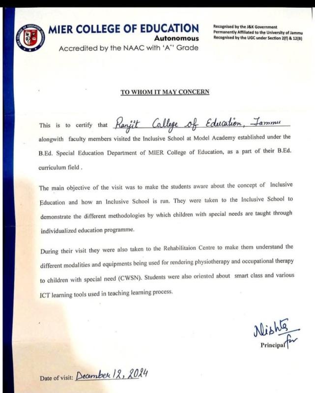 Students of B.Ed session 2024-26 semester-I visited Inclusive school as a part of their curriculum on 12 december 2024